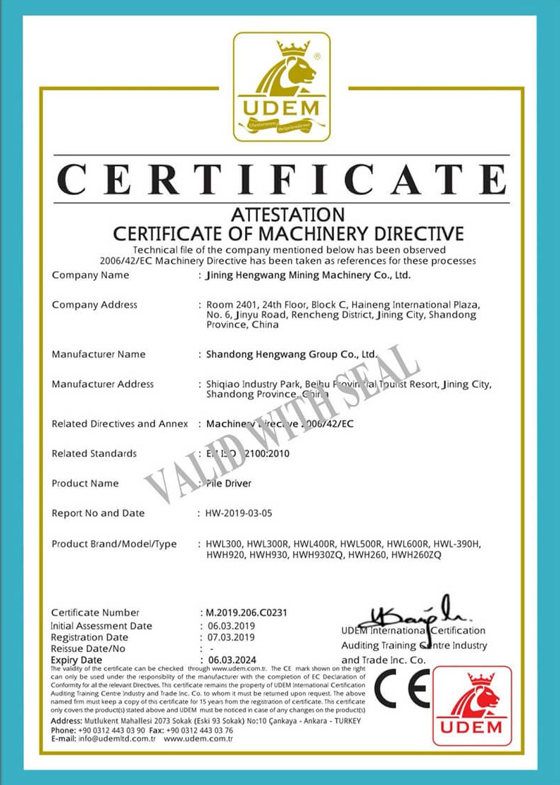 Attestation certificate of machinery directive